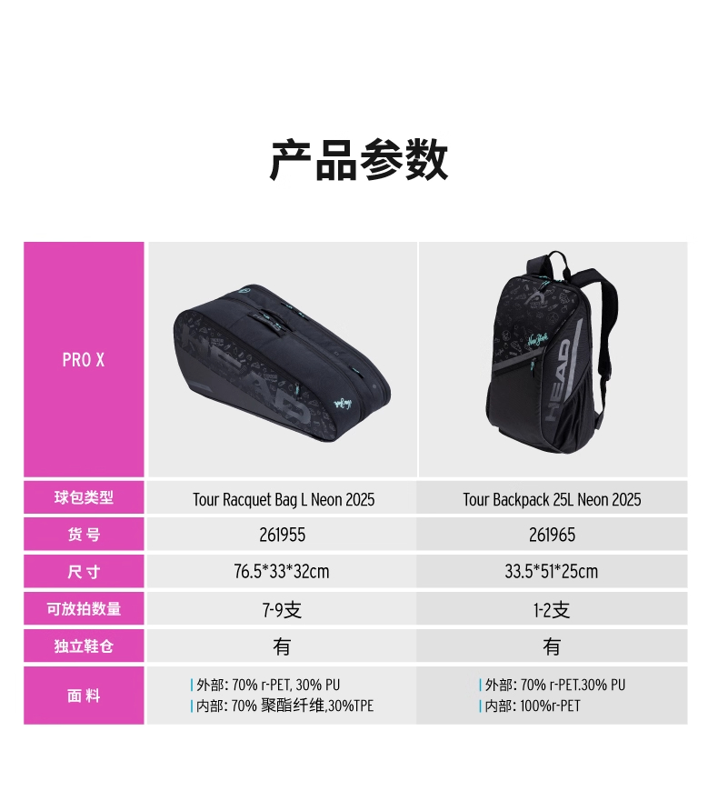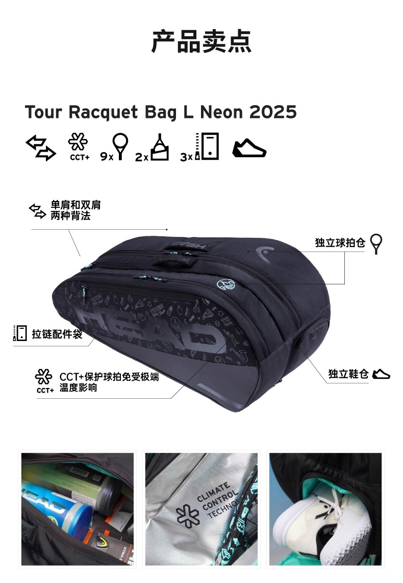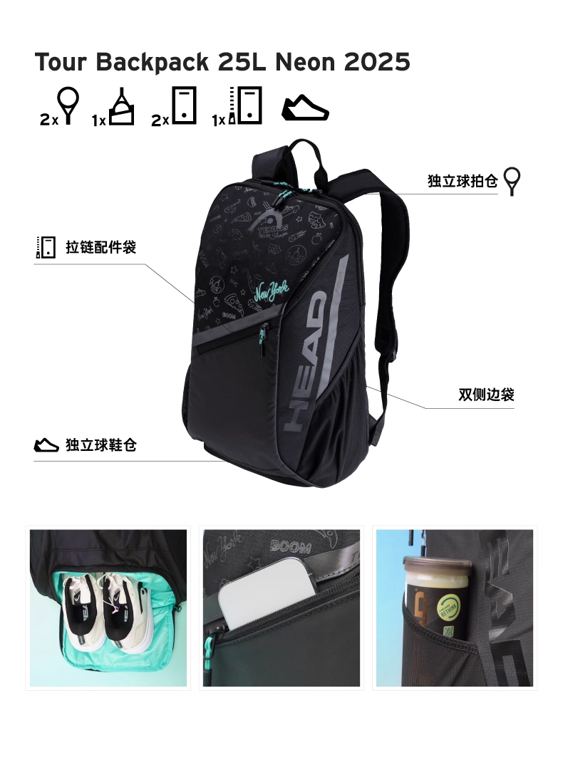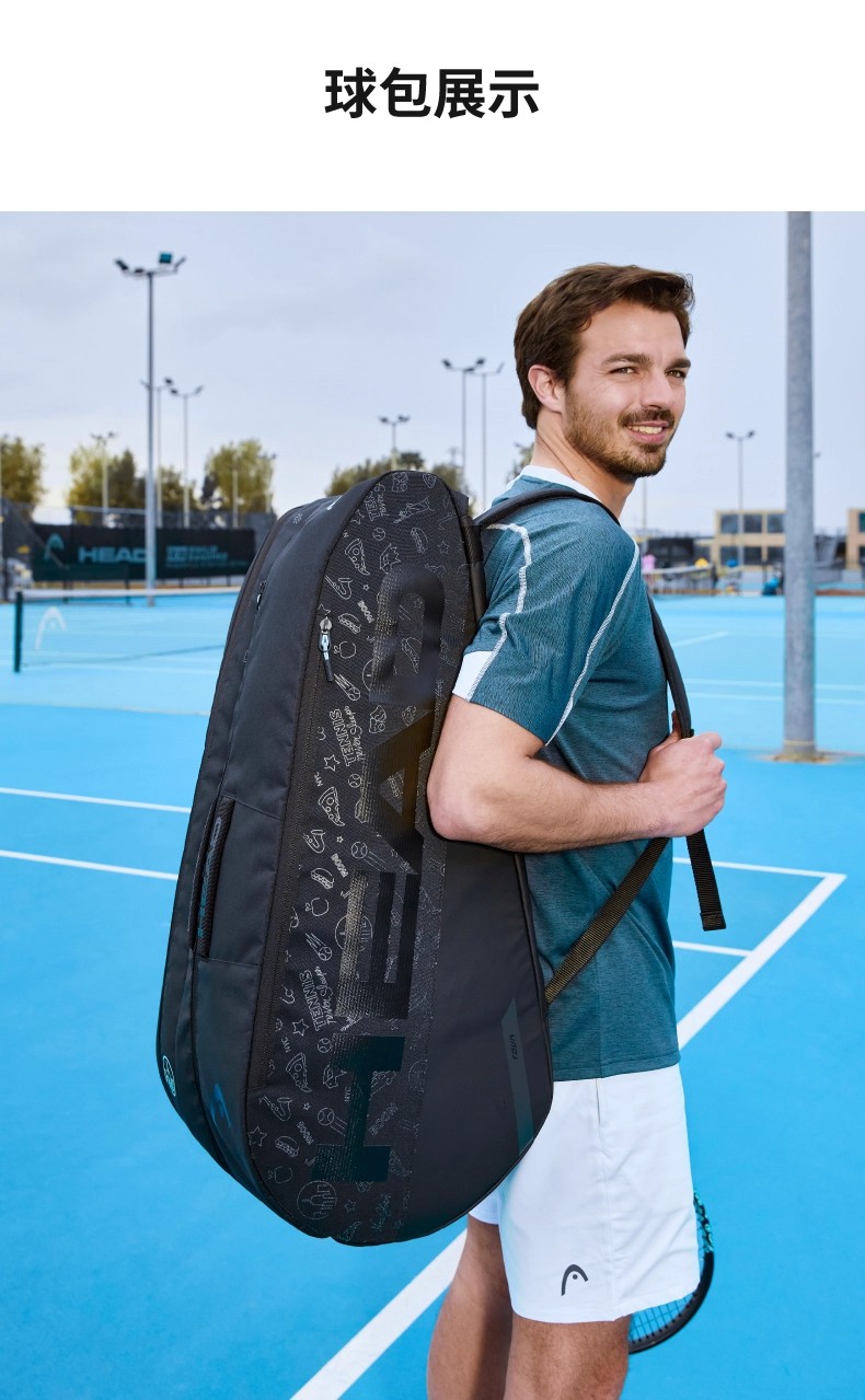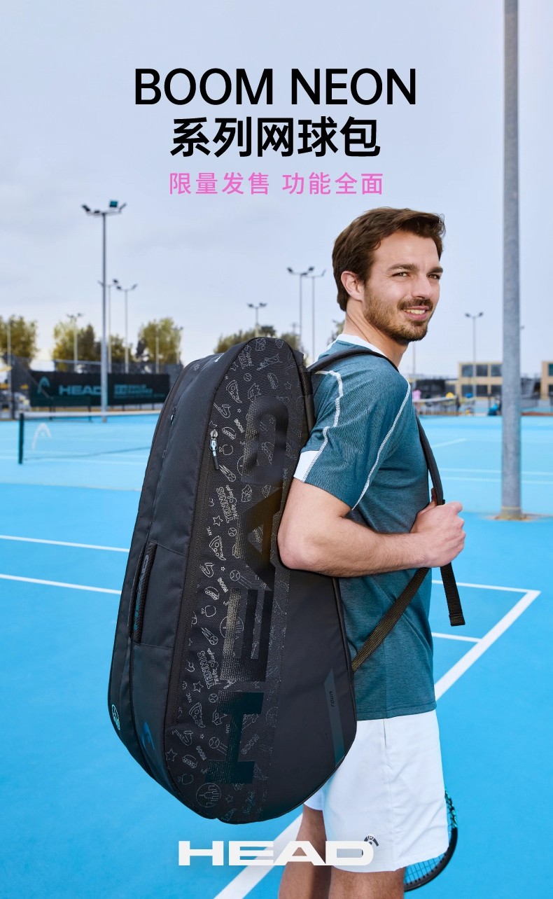HEAD海德网球包 BOOM NEON系列限量款美网款超大容量运动休闲网球包 双肩包 261965 黑色