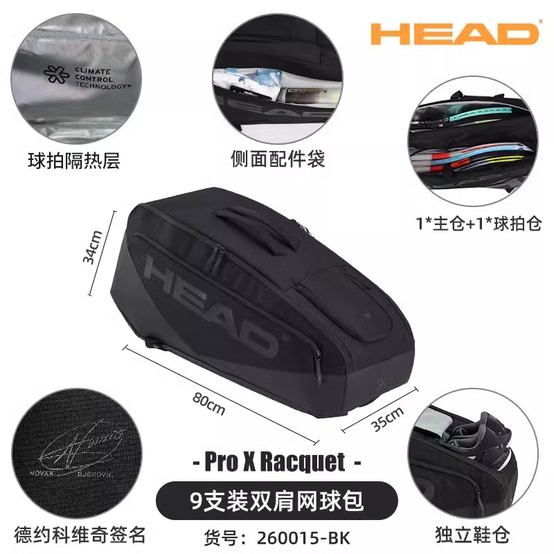 HEAD海德网球包 PRO X系列2025新款网球包9支装大容量旅行运动赛场包 260115 黑灰色