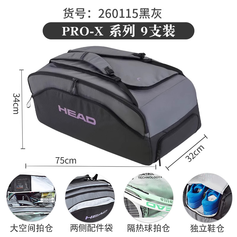HEAD海德网球包 PRO X系列2025新款网球包9支装大容量旅行运动赛场包 260115 黑灰色