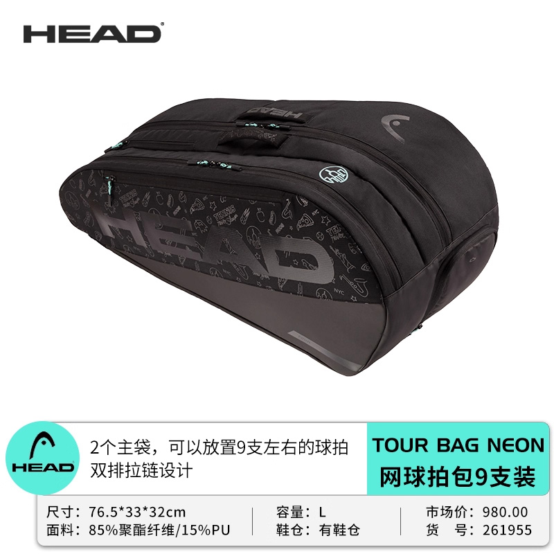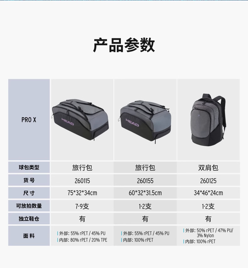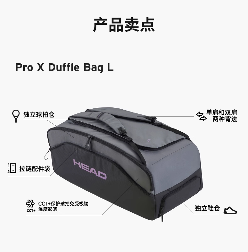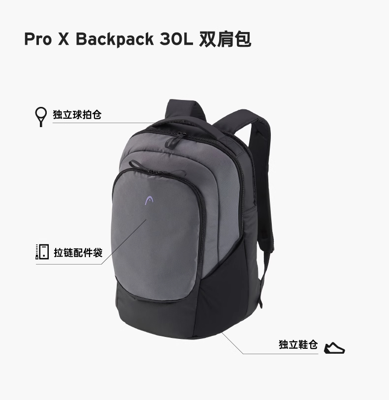 HEAD海德网球包 PRO X系列2025新款网球包双肩包旅行运动赛场包 260125 黑灰色