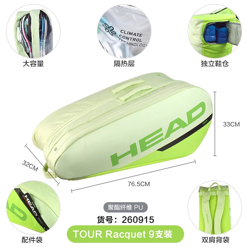 HEAD海德网球包 TOUR系列网球包背包运动拍包赛场包9支装大容量网球包 260915 黄绿色