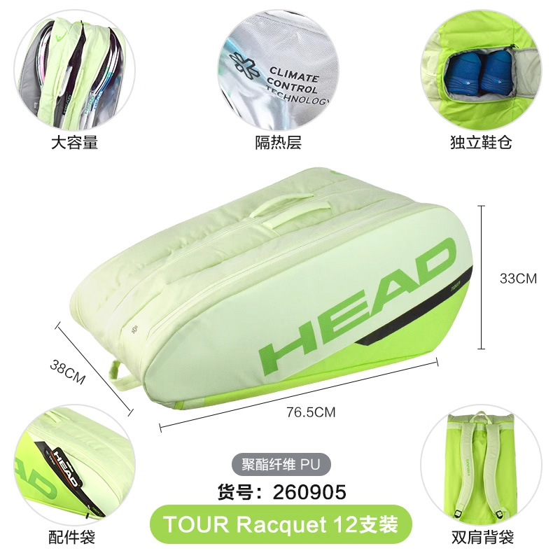 HEAD海德网球包 TOUR系列网球包背包运动拍包赛场包12支装大容量网球包 260905 黄绿色