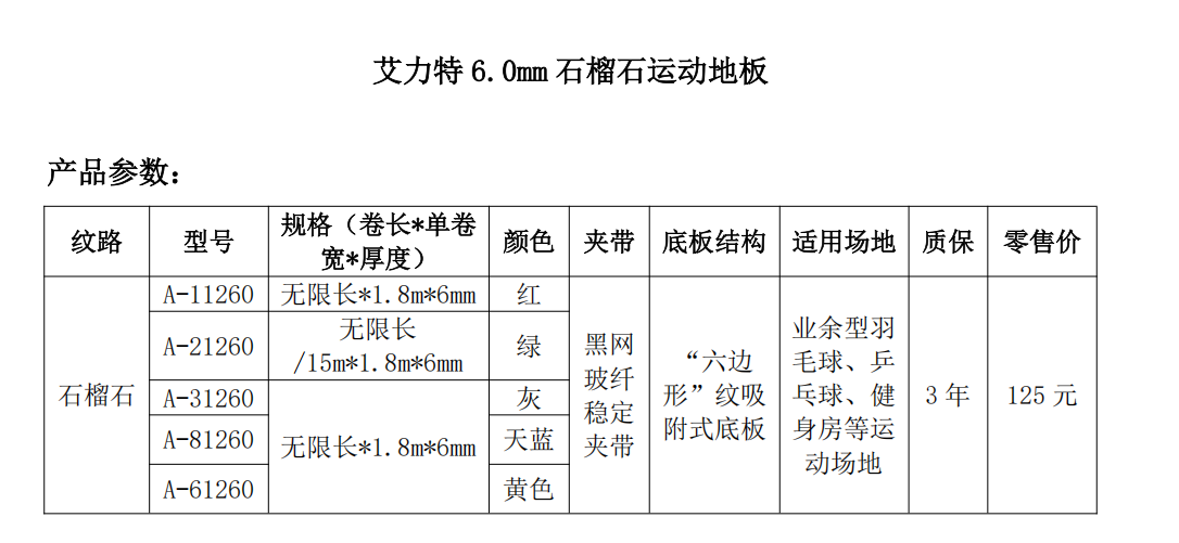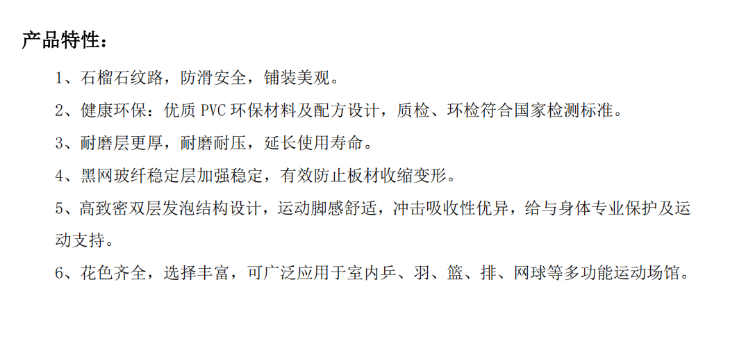 6、花色齐全,选择丰富,可广泛应用于室内乒、羽、篮、排、网球等多功能运动场馆。