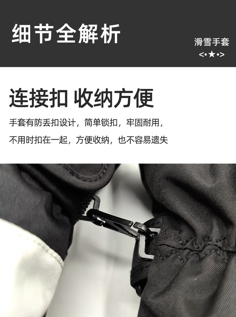 腕部加长设计 + 魔术贴调节,贴合手腕不灌风,还能防止雪水倒灌。