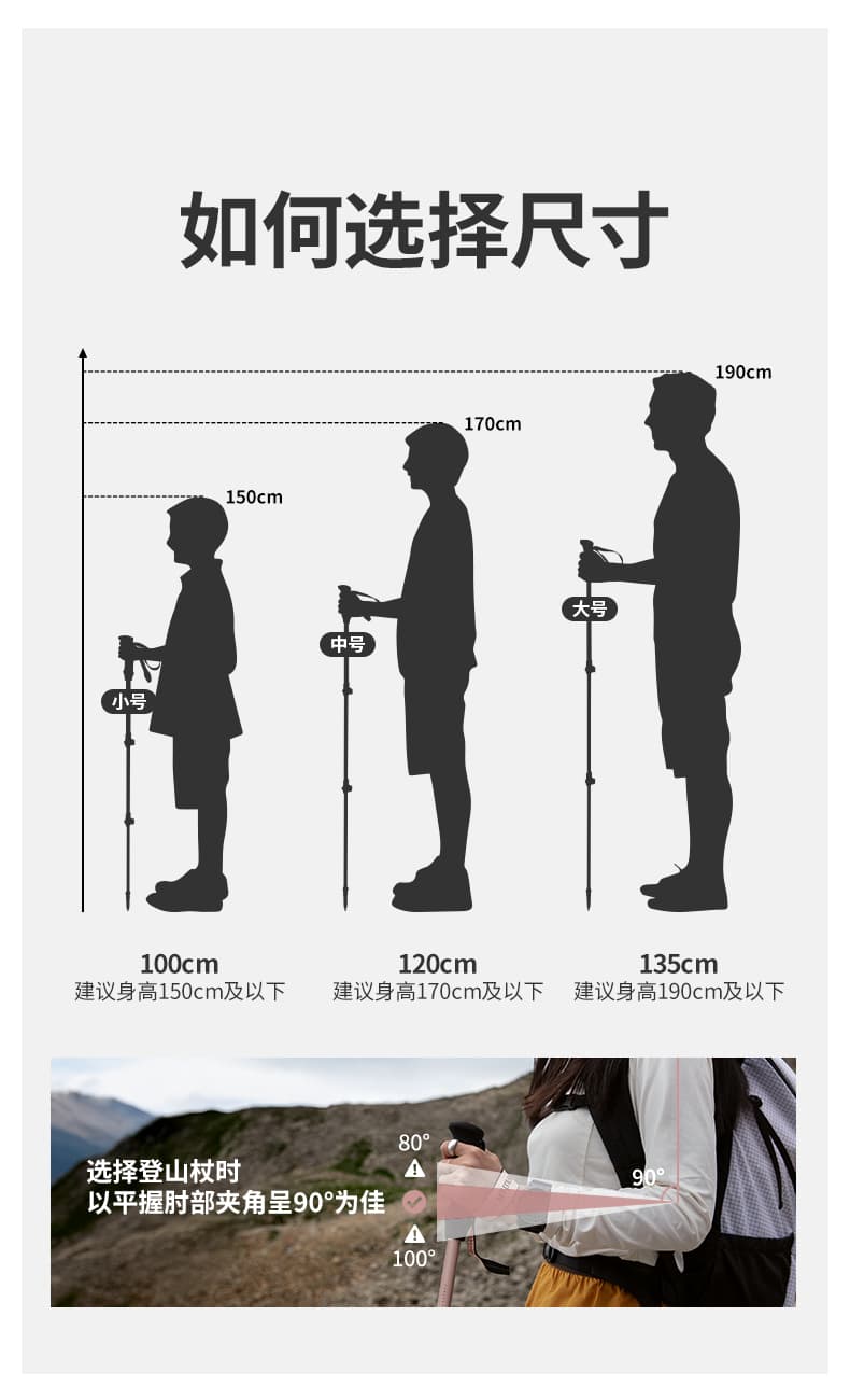三节外锁伸缩设计,调节范围适配不同身高与地形。
