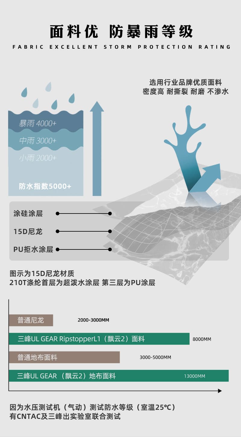 15D 高密涂硅面料,5000mm + 防水暴雨不渗透
