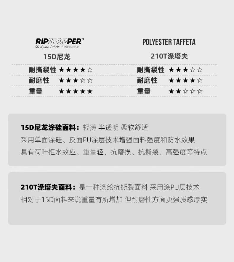 210T 高密度尼龙面料,抗撕裂耐磨,户外耐用抗造。