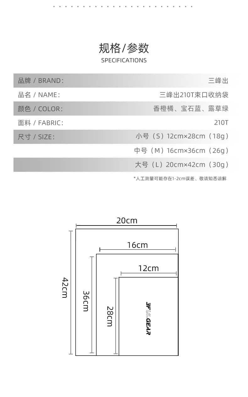 三峰 15D 束口收纳袋 L 码,超轻能装多场景适配。