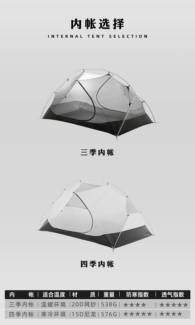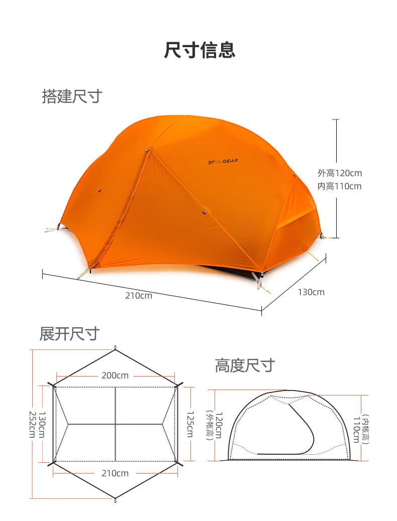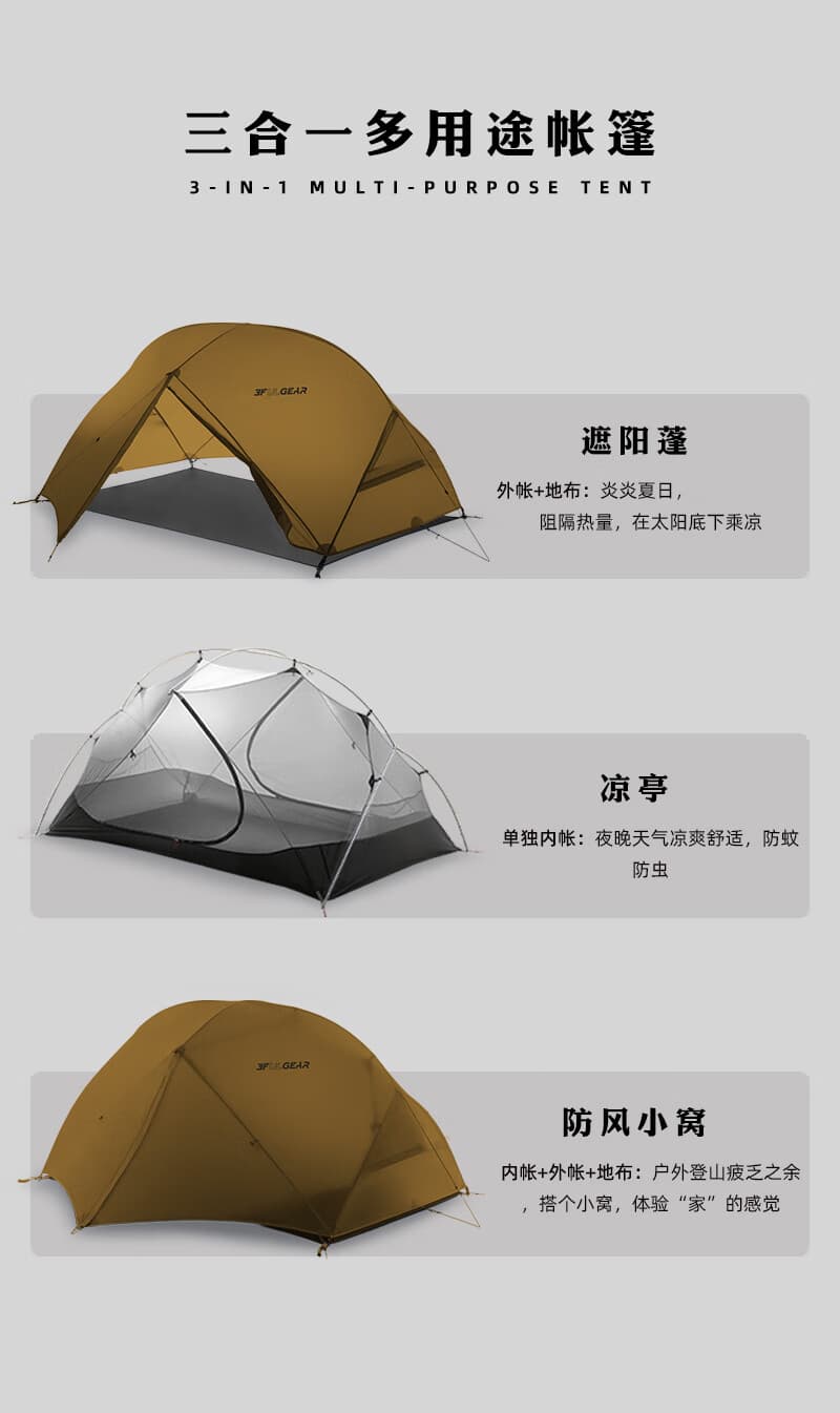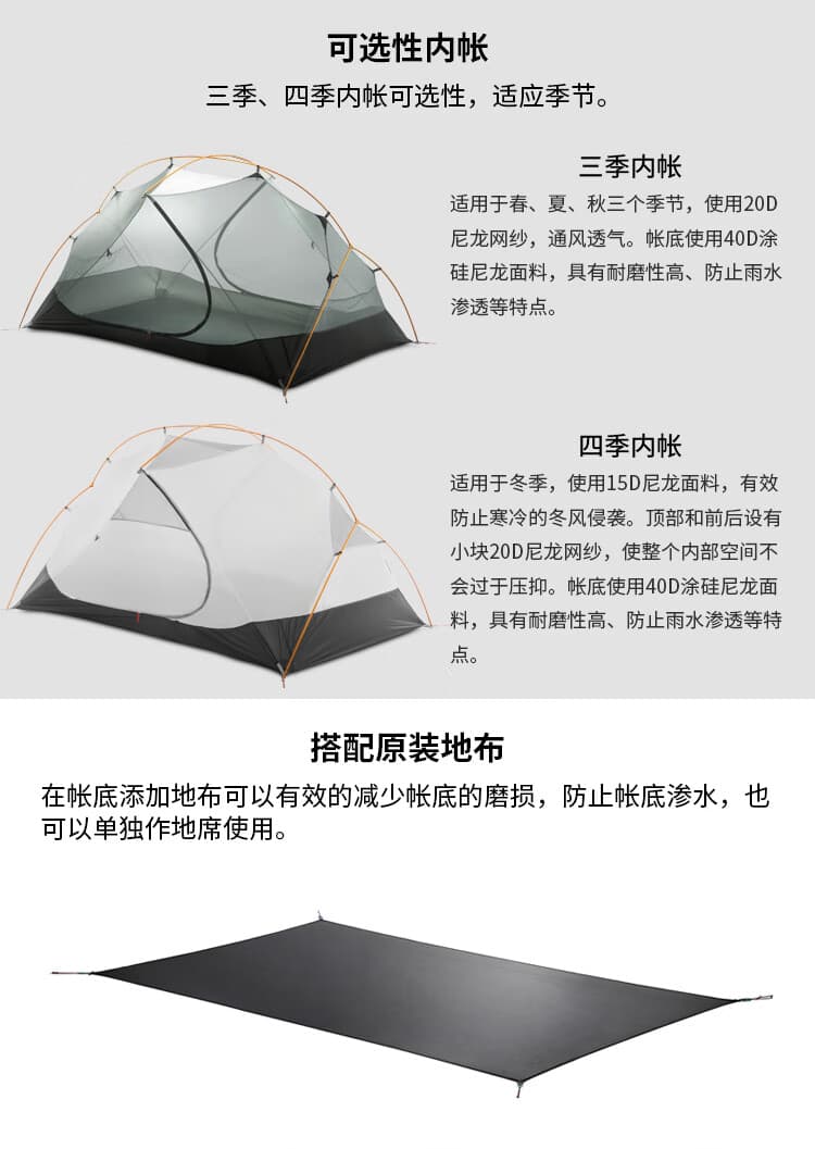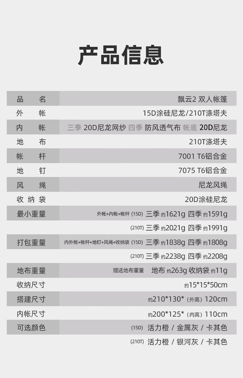 三峰飘云 2 双人 210T 三季帐,活力橙 / 金属灰 / 卡其色三色可选。