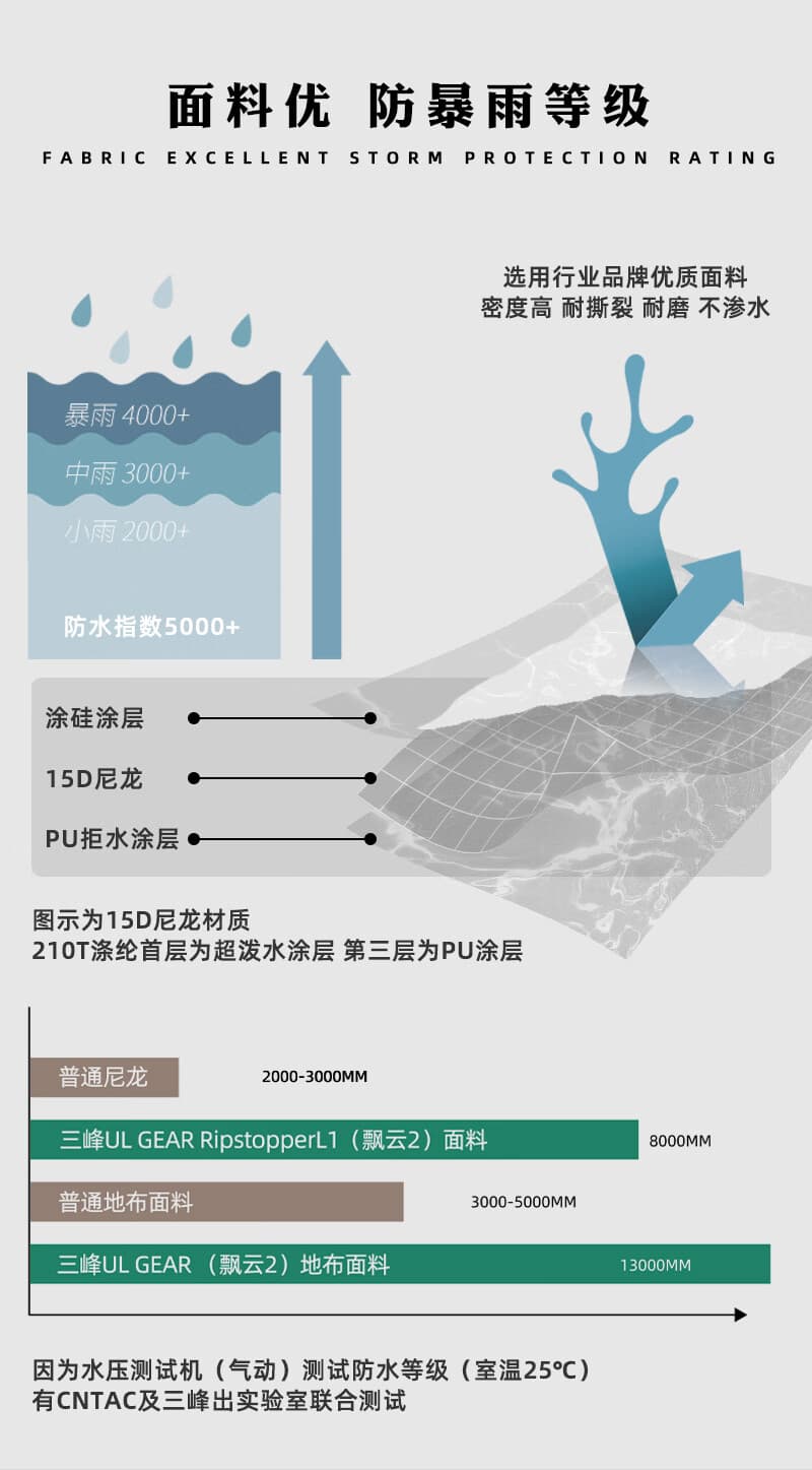 外帐 210T 涤塔夫,4000mm 防水,雨天露营干爽无忧。