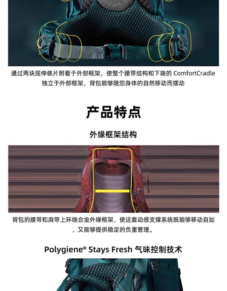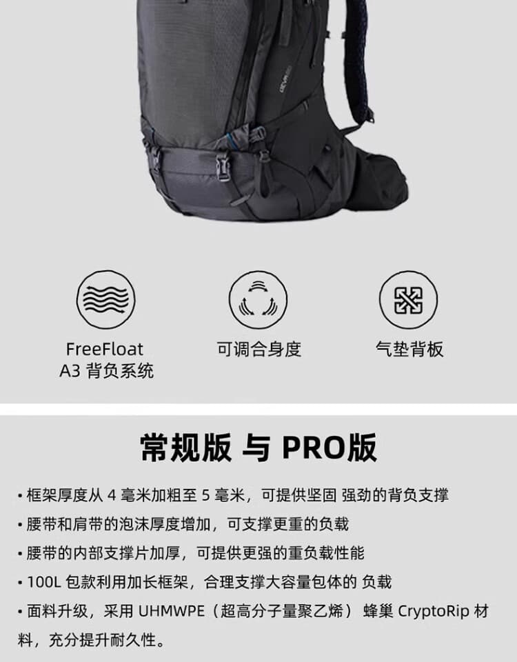 以“70L超大容量+FreeFloat A3专属背负+强支撑轻量设计”为核心