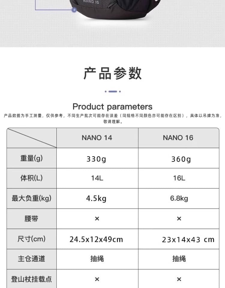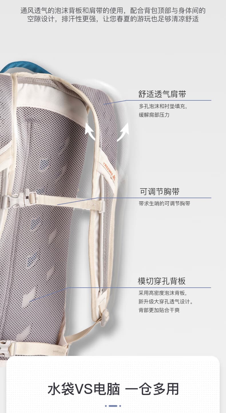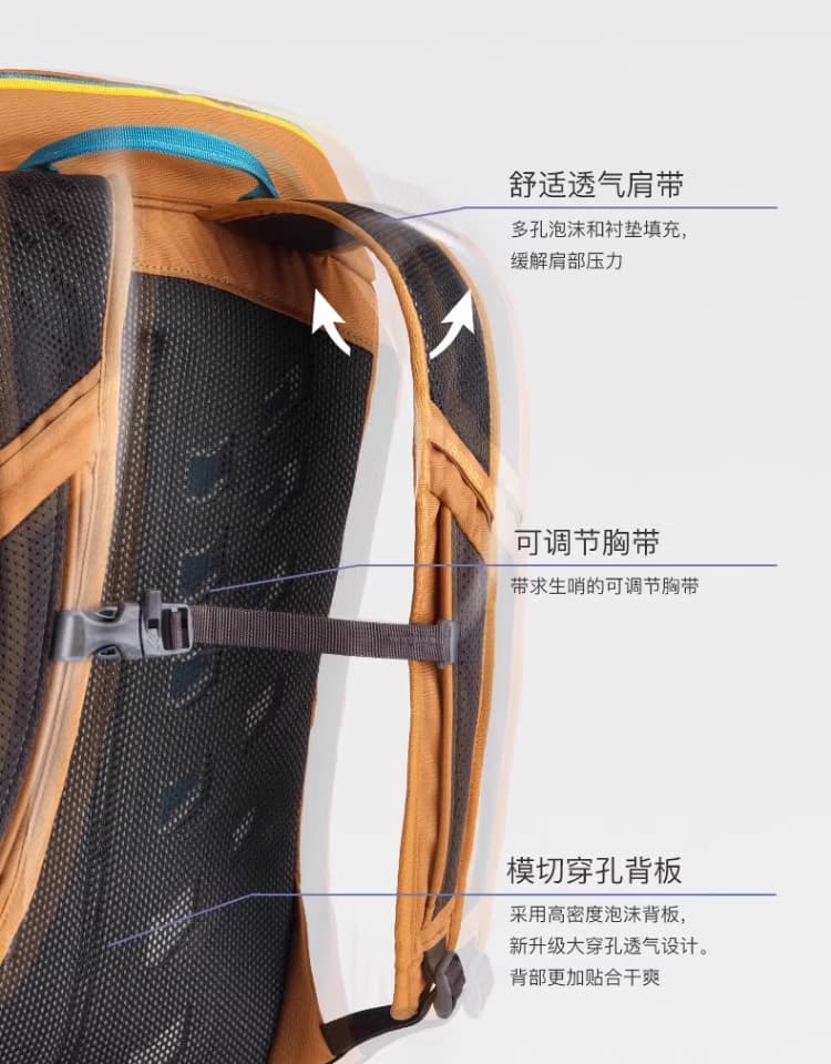 轻量化透气背负系统:搭载透气背板与加垫网眼肩带,背板采用立体透气设计,避免“闷汗粘背”,长时背负依旧舒适;,同时适配14"-19"(约35.5-48cm)背长,贴合多数身形,无需复杂调节。