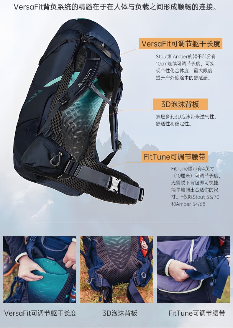 VersaFit精准可调背负系统:4英寸(约10cm)连续调节范围,适配16"-21"(40-53cm)背长,1个尺码覆盖绝大多数男性身形,无需为背长适配烦恼;搭配多孔3D打孔泡沫背板,空气流通性强,徒步全天背部干爽不闷热,解决传统背包“闷汗粘背”痛点,长时背负更舒适。