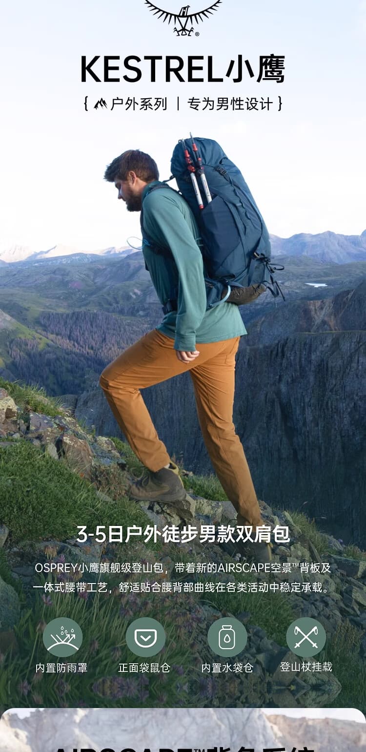 作为 Osprey 专为女性打造的重装徒步包,采用超轻空速悬挂背负系统 + 4 毫米粉末涂层 LightWire 框架,搭配可调节背板与贴合女性肩背曲线的 EXOFORM 背带和腰带,负载范围 11 - 14kg,能高效分散重量。主体选用 bluesign? 认证再生抗撕裂尼龙布,搭配无 PFC/PFAS 的 DWR 涂层,耐磨抗造且环保;48L 容积搭配独立睡袋仓,主仓内还设 3L 储水仓,顶包可卸除且自带拉链袋,两侧弹力网袋 + 拉链腰带口袋满足分类收纳需求。配备 Stow-On-The-GO 登山杖固定带与冰镐挂环,内置隐藏式防雨罩,应对复杂户外装备收纳与防护需求。