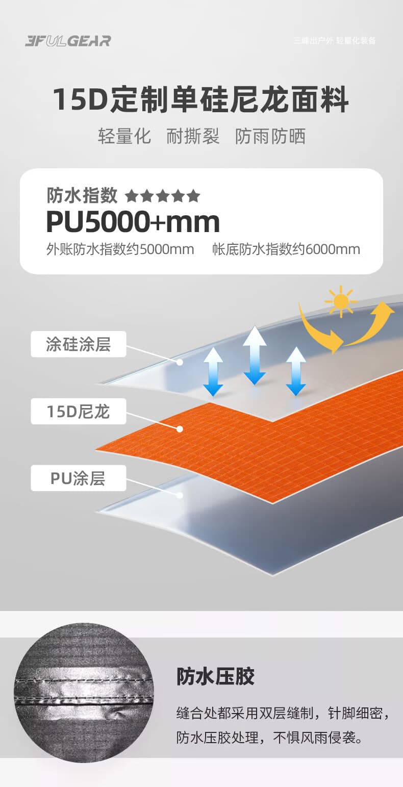 20D 单面涂硅面料,防水指数 4000MM,阻隔地面湿气积水。
