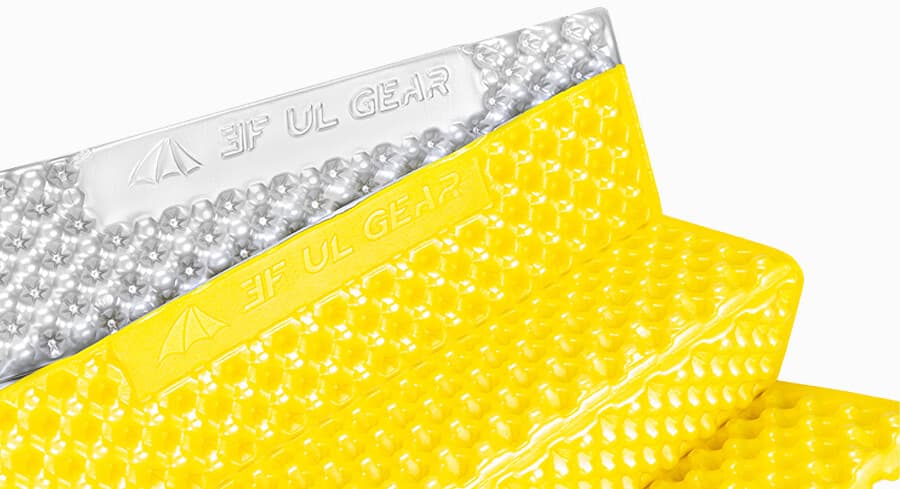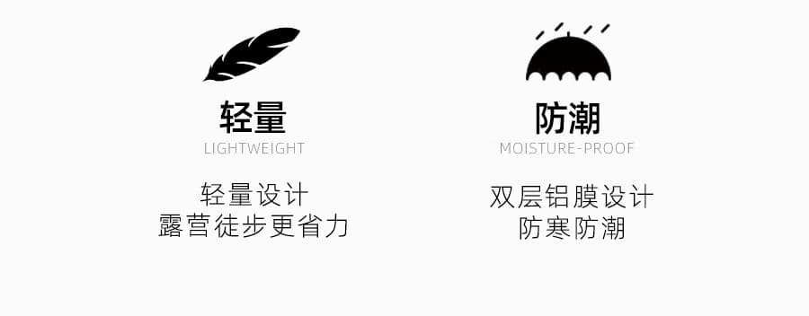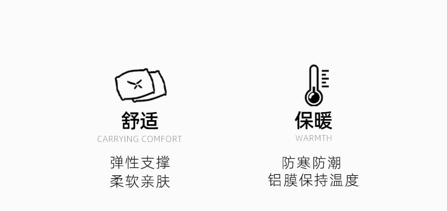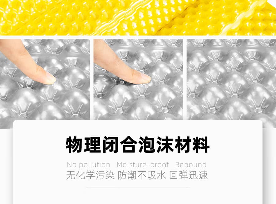 高海拔登山时,双面铝膜可反射热量,防止身体失温,保障户外?踩?br/>低海拔徒步时,蛋巢面防潮隔热,回弹性好,提供舒适的休息体验。