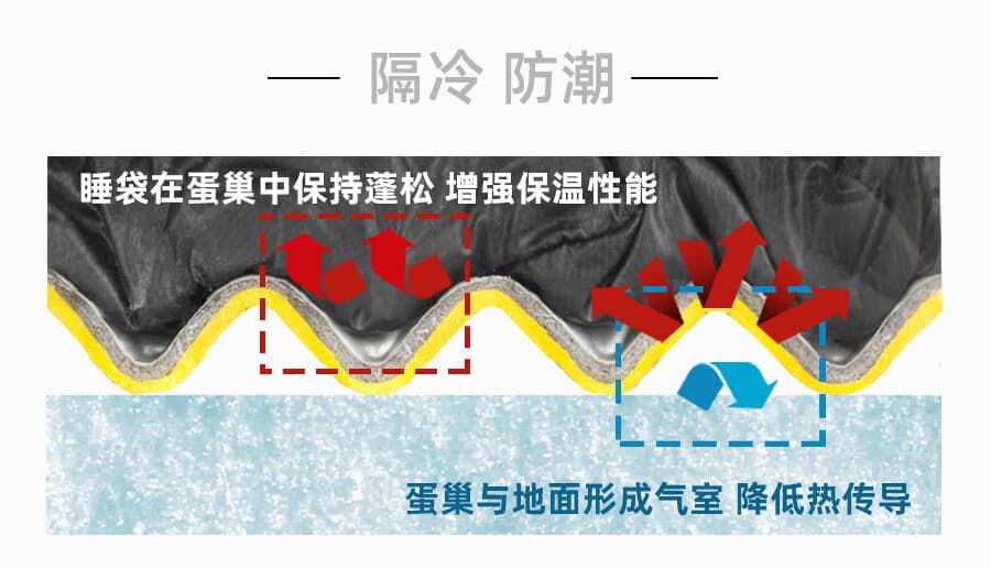 精准阻?舻孛媸⒑肼端词乖诔笔莸鼗虻臀律降匾材鼙3炙娓伤屡?br/>经典蛋槽结构设计,凹巢内可有效留存空气,增强保温效果,同时提升睡垫稳定性。
