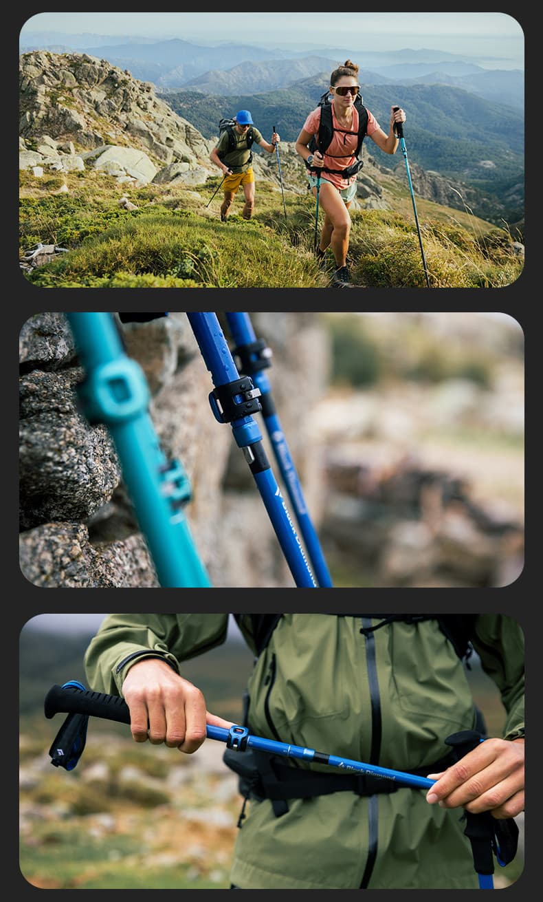 源自雪崩探测杆设计,三截式折叠结构,通过锥形连接与内置拉绳,一拉即开、一按即折,展开速度比普通折叠杖快一倍,越野中途切换场景高效不拖沓。