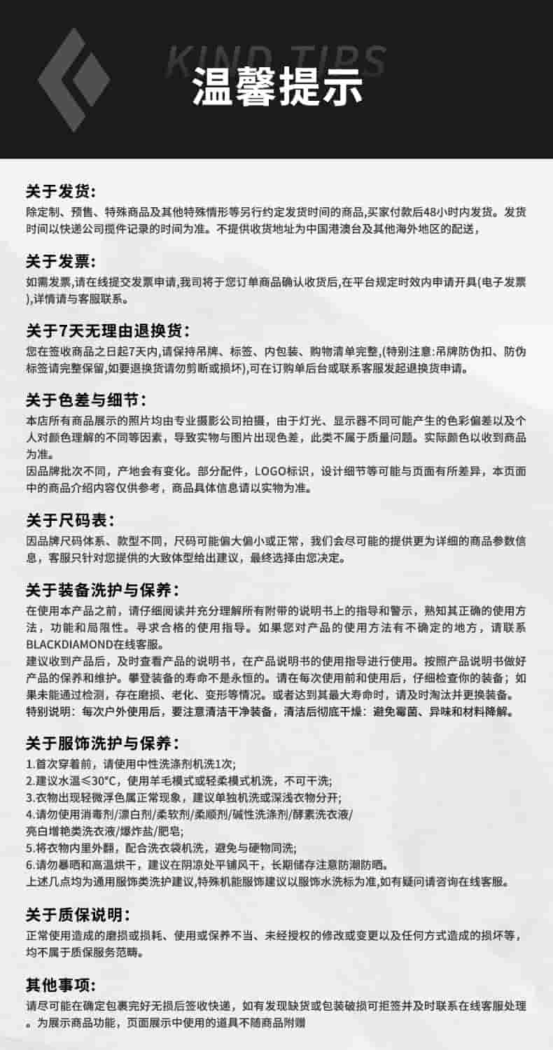 2)七天退换保障:自您签收商品后7天内,因尺码不合适,货品外观大小,颜色,形状的感受偏差,订购错误等,在商品未使用、未拆毁包装、未剪掉或丢失吊卡说明书等不影响二次销售的情况下,可以为您退换商品(下文中说明的不能退换的商品除外)。