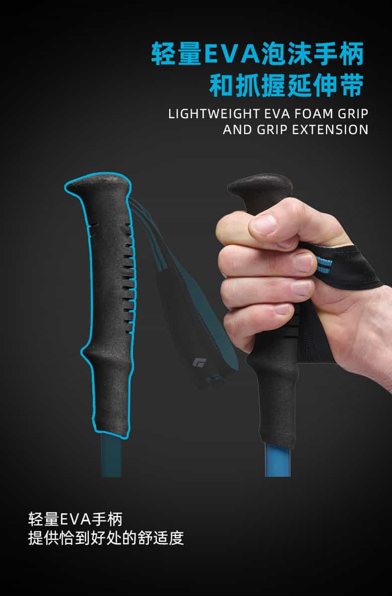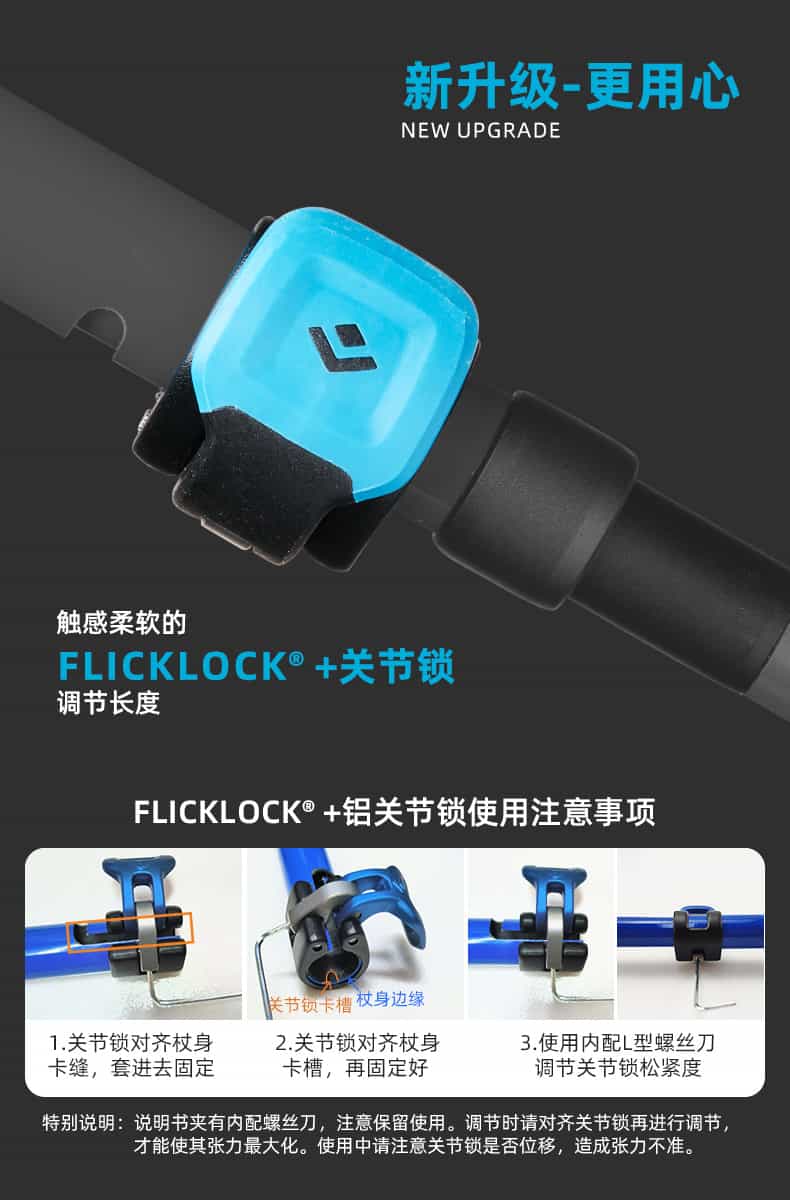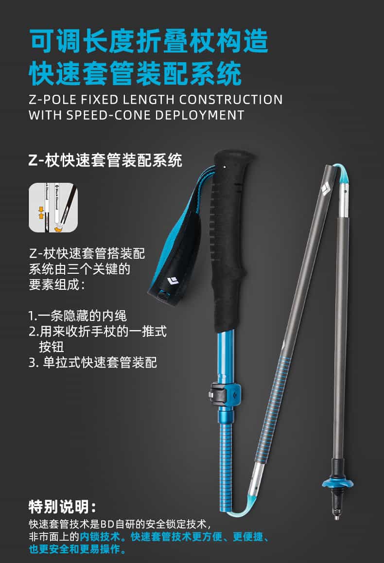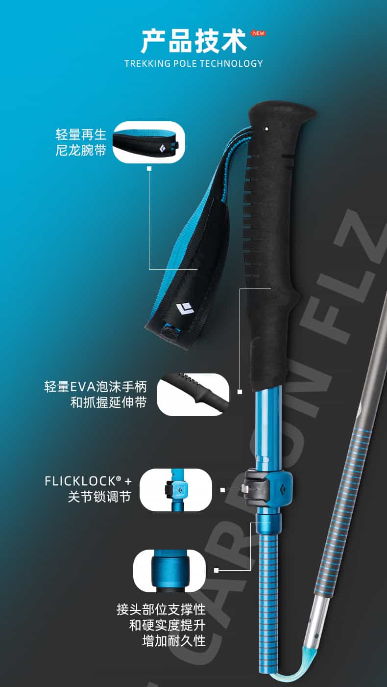 FLZ是Black Diamond的技术缩写,F=FlickLock(快速锁定系统),L = 可调节长度,Z=Z-Pole 折叠技术