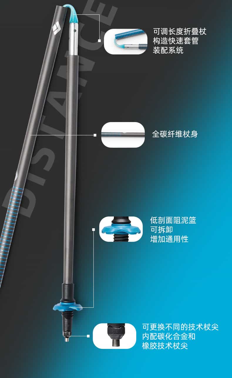 DISTANCE意为远程 / 长距离,表明专为长距离徒步、越野跑等设计的登山杖。