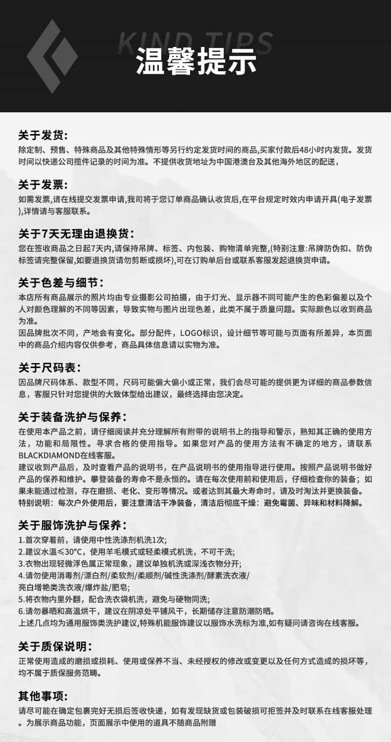 2)七天退换保障:自您签收商品后7天内,因尺码不合适,货品外观大小,颜色,形状的感受偏差,订购错误等,在商品未使用、未拆毁包装、未剪掉或丢失吊卡说明书等不影响二次销售的情况下,可以为您退换商品(下文中说明的不能退换的商品除外)。