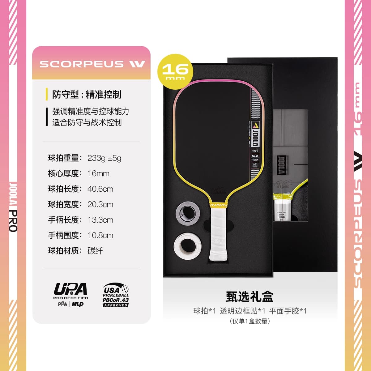 JOOLA优拉 匹克球拍 Magnus Pro IV碳纤维USAPA/UPA双认证专业匹克球拍 14mm-渐变粉 600147【亚洲限定新品礼盒装】 更大甜区和更高容错率,适合远距离大力击球
