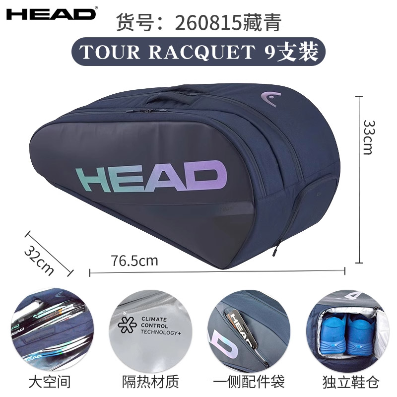 HEAD海德网球包 25新款TOUR系列双肩包男女款专业拍包手提大容量9支装网球包 260815 藏青色本品参加12.12返场特惠满129减20 299减50 499减80 999减150元大促!