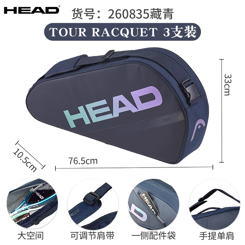 HEAD海德网球包 25新款TOUR系列双肩包男女款专业拍包手提大容量3支装网球包 260835 藏青色本品参加12.12返场特惠满129减20 299减50 499减80 999减150元大促!