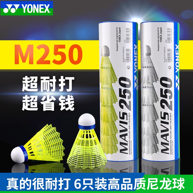 尤尼克斯YONEX羽毛球 尼龙球6只装 MAVIS250(M-250)训练用羽毛球室外娱乐用球超级耐打稳定抗风台产尼龙球,超级耐打训练娱乐 白色和黄色可选