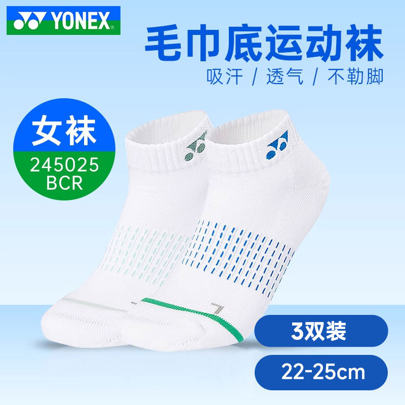 YONEX 尤尼克斯 羽毛球袜 女款 运动短袜 加厚毛巾底 245025BCR 22-25cm 3双装吸湿排汗,柔软舒适 3双装