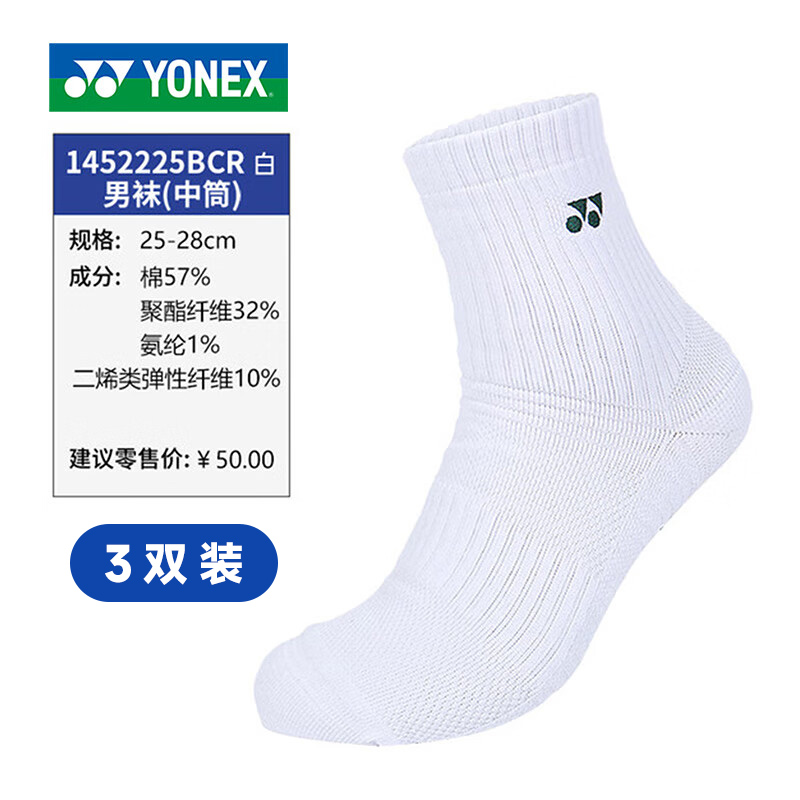 YONEX 尤尼克斯 羽毛球袜 男款中筒袜 加厚毛巾底 yy专业比赛运动袜 1452225BCR 白色 25-28cm 3双装舒适透气 3双装更实