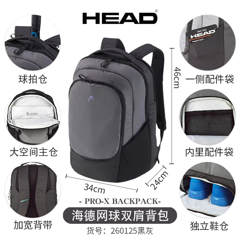 HEAD海德网球包 PRO X系列2025新款网球包双肩包旅行运动赛场包 260125 黑灰色本品参加11.11狂欢购满129减20 299减50 499减80 699减100 999减150 1299减200元大促!