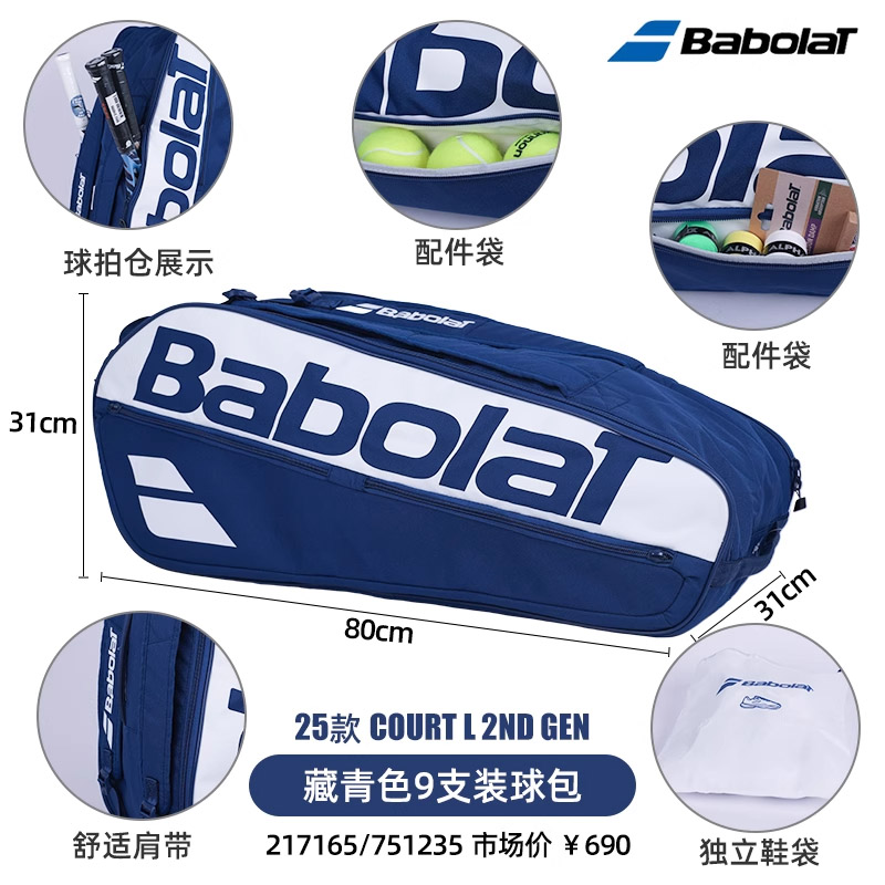 Babolat百保力网球包 EVO系列25新款舒适多功能大容量网球包 9支装 751235 藏青色本品参加11.11狂欢购满129减20 299减50 499减80 699减100 999减150 1299减200元大促!