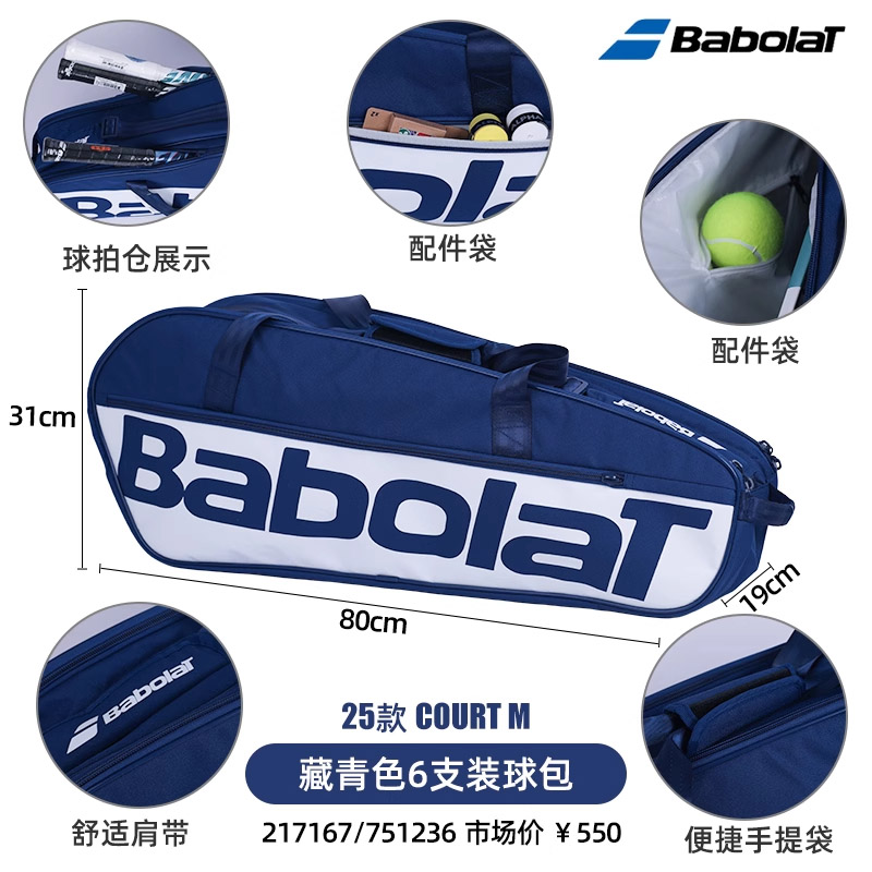 Babolat百保力网球包 EVO系列25新款舒适多功能大容量网球包 6支装 751236 藏青色本品参加11.11狂欢购满129减20 299减50 499减80 699减100 999减150 1299减200元大促!