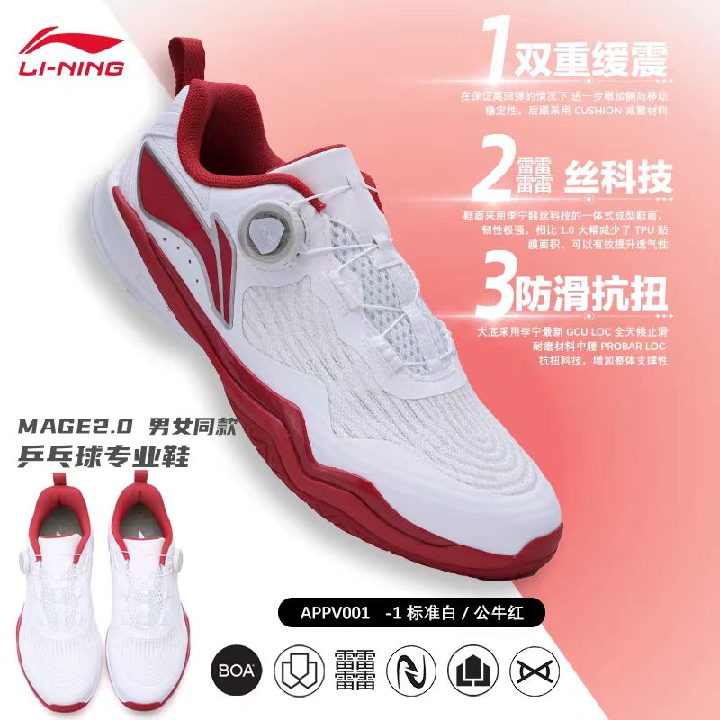 LINING李宁 乒乓球鞋 国家队同款MAGE 2.0男女同款 BOA旋钮专业比赛运动鞋 APPV001-1标准白/公牛红本品参加11.11狂欢购满129减20 299减50 499减80 699减100 999减150 1299减200元大促!