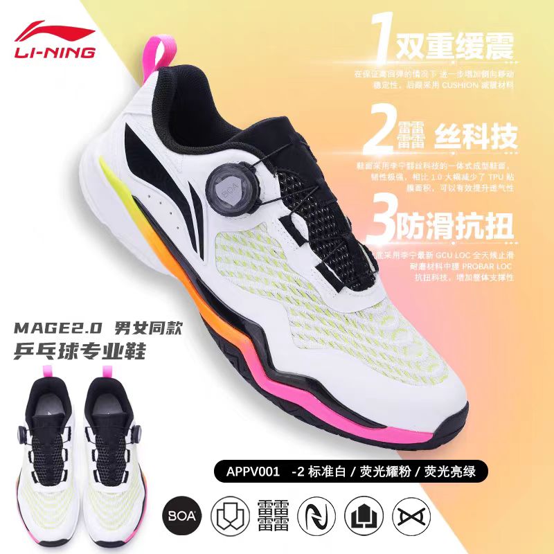 LINING李宁 乒乓球鞋 国家队同款MAGE 2.0男女同款 BOA旋钮专业比赛运动鞋 APPV001-2 标准白/荧光耀粉/荧光亮绿BOA适配系统,方便快速穿脱