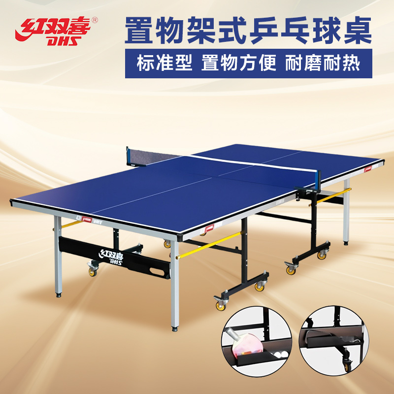 红双喜DHS T1010乒乓球桌 置物架式高级单折式可折叠乒乓球台 可移动带轮子家用场馆标准案子 送网架红双喜新品球台 单折叠 弹性好 钢管厚重 22mm台板