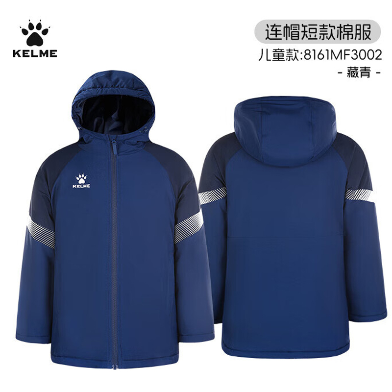 KELME卡尔美 儿童连帽短款棉服 男女童短款冬季保暖足球训练服棉衣 8161MF3002 藏青,401温暖出行 保暖御寒