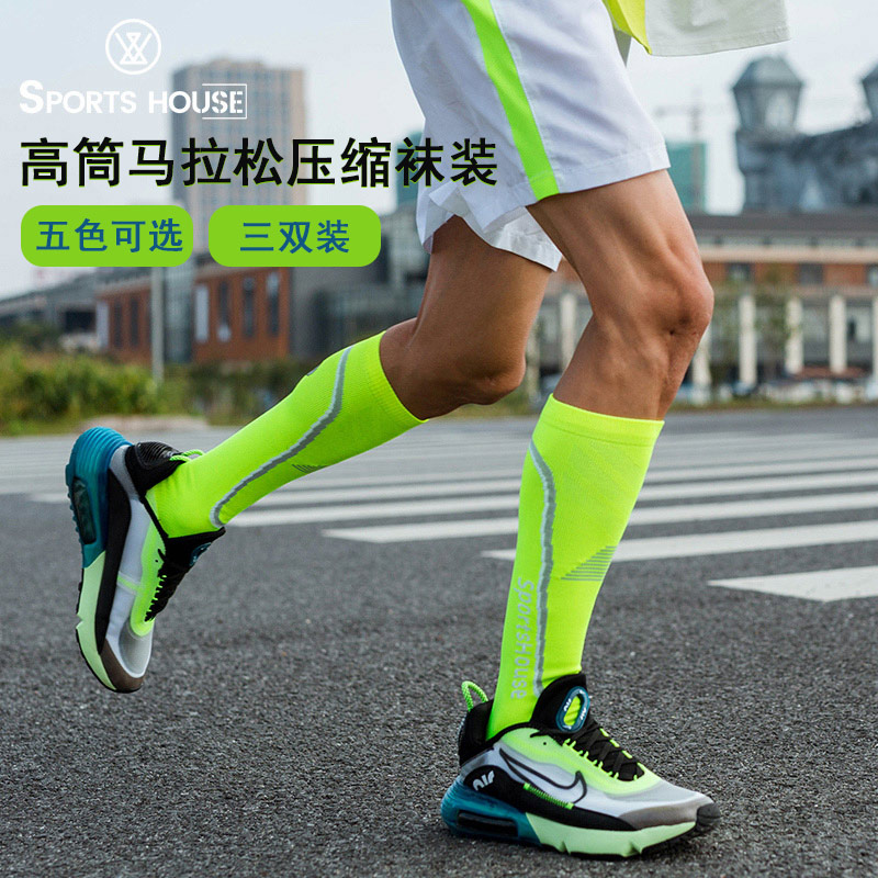 Sports House运动之家 马拉松长筒袜 男士专业跑步袜 高筒吸汗防臭袜 毛巾底压缩运动袜 SH1047 五色可选 三双装压缩小腿,支撑足弓