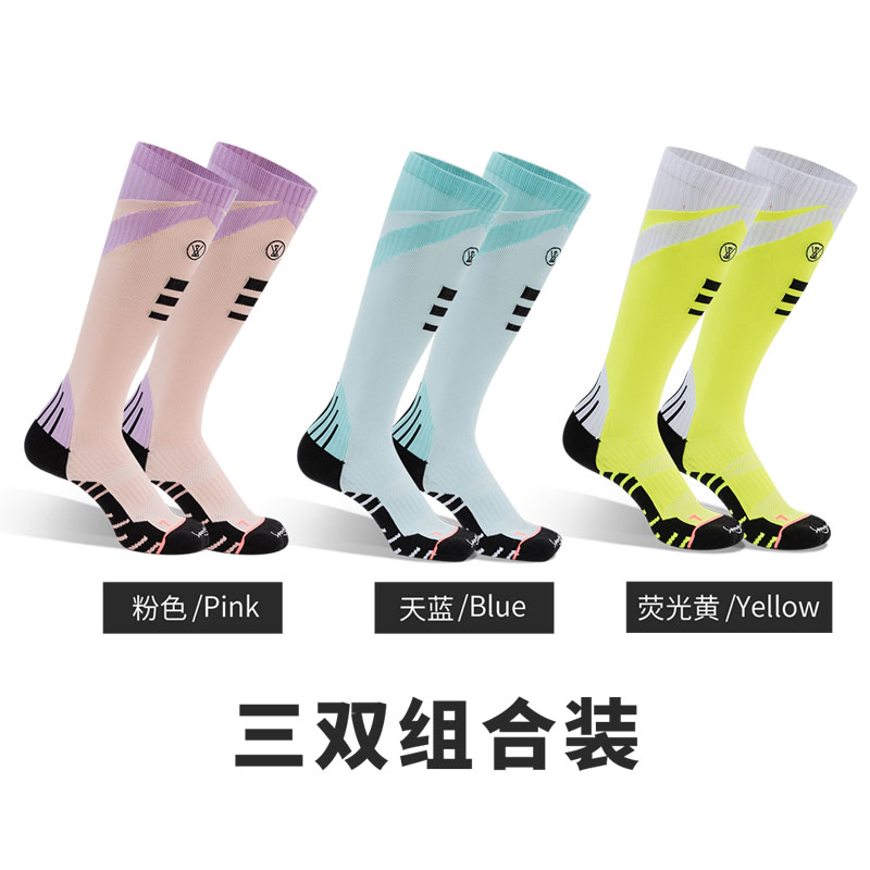 Sports House运动之家 速干马拉松长袜 女士专业跑步袜 长筒压缩袜 防滑透气跑步跳绳吸汗防臭袜 毛巾底压缩运动袜 SH2022 五色可选 三双装大线条纹理设计,拉高显瘦