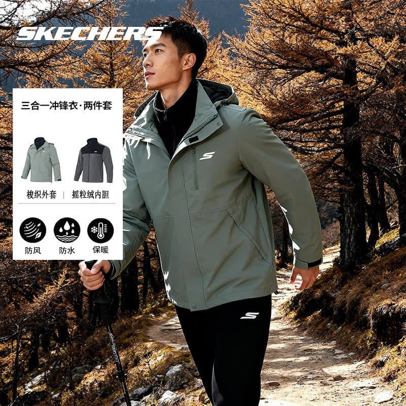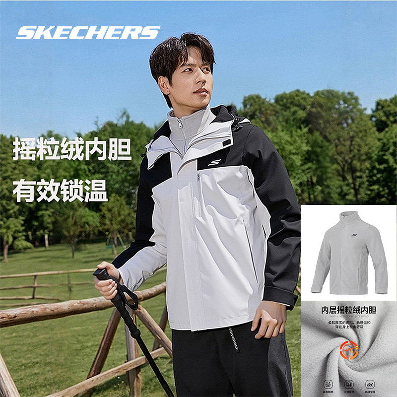 SKECHERS斯凯奇 三合一夹克 男女款户外运动服登山服 防水冲锋款夹克外套 P425U074-0068 阴影色摇粒绒内胆 有效锁温
