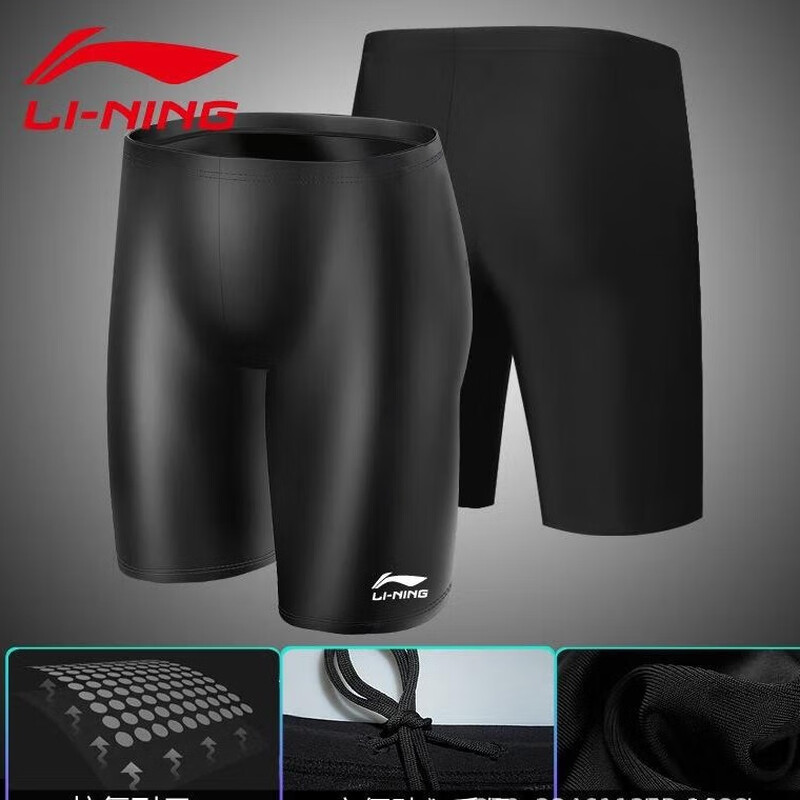 角标 LINING李宁 男士泳裤 五分泳裤 专业游泳裤 速干平角泳裤 LXKU833-1 黑色立体裁剪 舒适贴身