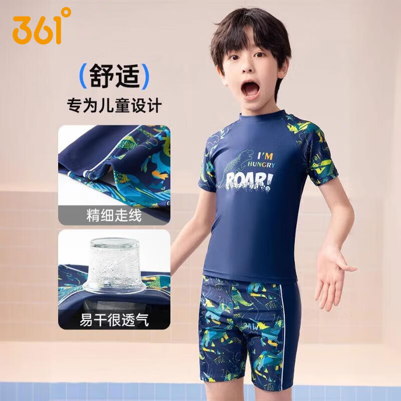 361度 儿童游泳套装 2025新款分体泳衣 大童男孩青少年泳衣泳裤套装 SLY215034 深蓝透气面料 柔软亲肤