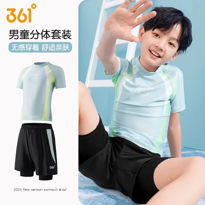 361度 儿童游泳套装 2025新款分体泳衣 中童男孩青少年泳衣泳裤套装 SLY25Y5003 蓝绿色透气面料 柔软亲肤