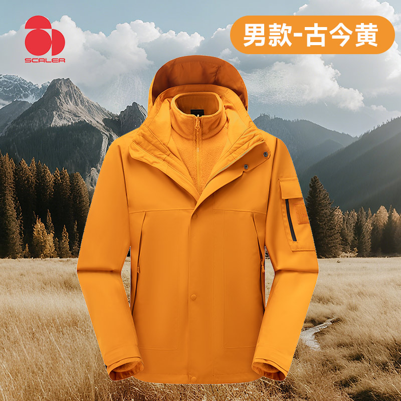 SCALER思凯乐 男冲锋衣 户外冲锋衣男秋冬可拆卸抓绒内胆防水保暖登山外套 F2416623 古今黄YKK拉链 加绒保暖 全面防风 挺括修身