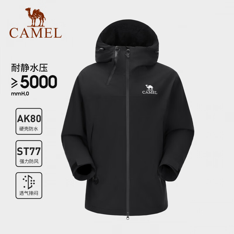 骆驼CAMEL户外春秋季新款冲锋衣男款防风防水夹克外套 AD12263538A幻影黑三防科技 强力防水