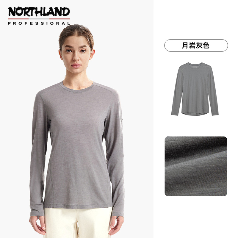 NORTHLAND诺诗兰 女 美利奴羊毛长袖 25新吸湿排汗透气运动抑菌徒步上衣 NTSFH2582E 月岩灰色吸湿排汗 清新抑菌