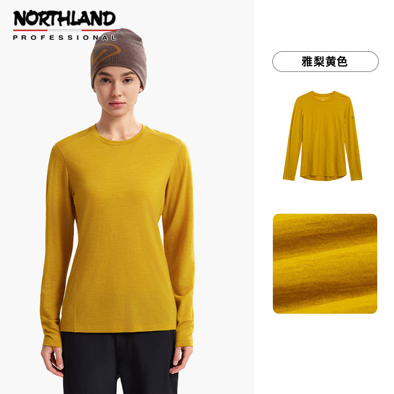 NORTHLAND诺诗兰 女 美利奴羊毛长袖 25新吸湿排汗透气运动抑菌徒步上衣 NTSFH2582E 雅梨黄色吸湿排汗 清新抑菌